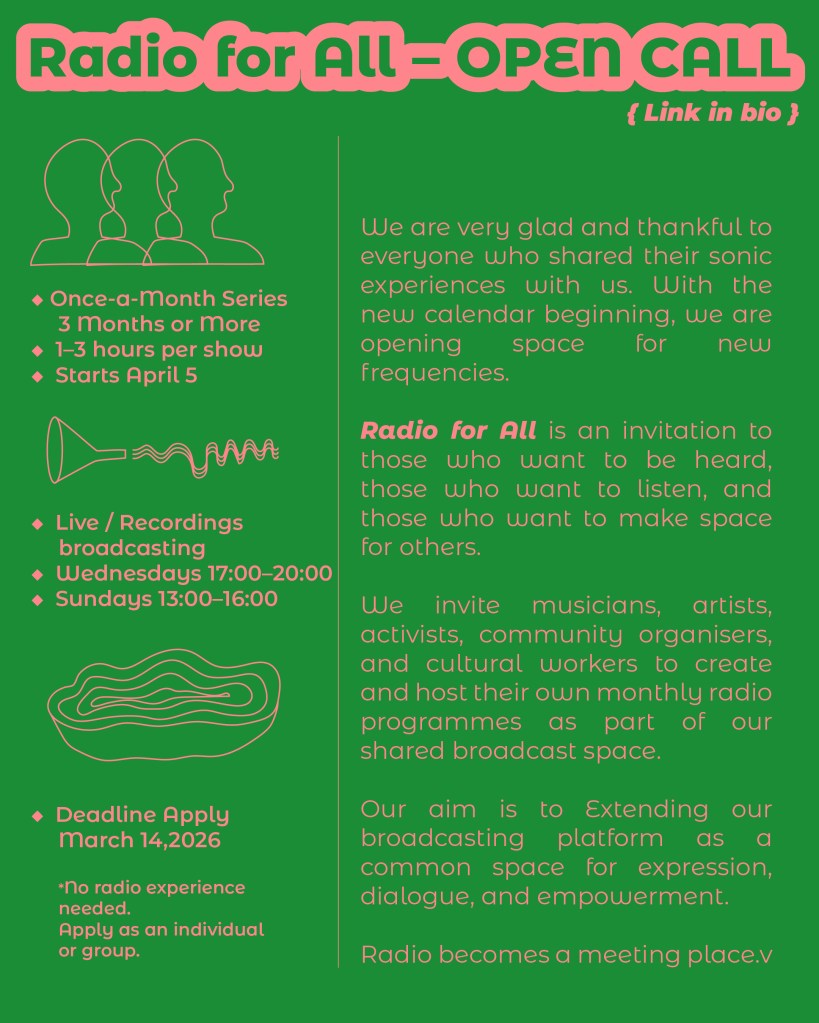 Radio for All is an invitation to those who want to be heard, those who want to listen, and those who want to make space for others. We invite musicians, artists, activists, community organisers, and cultural workers to create and host their own monthly radio programmes as part of our shared broadcast space.